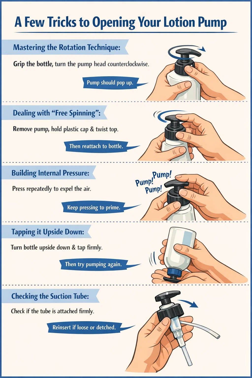 新しく購入したスキンケア製品で最もイライラするのは、ローションのポンプが動かないことです。実際、これらのポンプヘッドは、漏れを防ぐために工場で特別なロック機構を備えて設計されています。