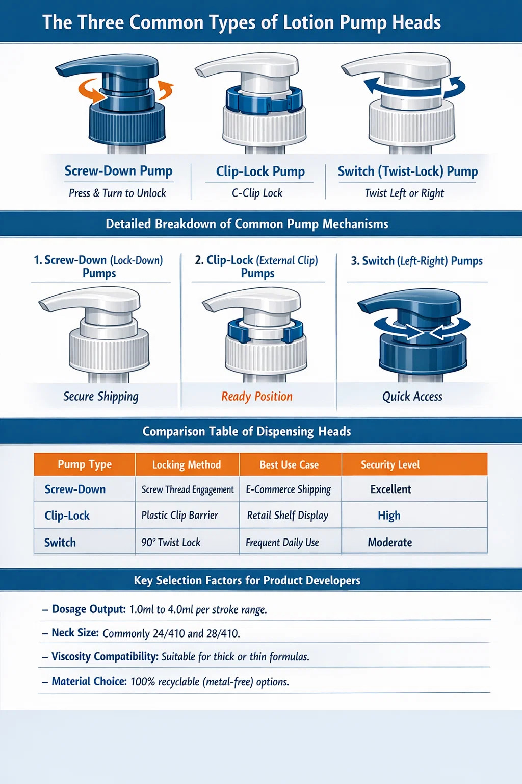 包装業界では、この用語は、 一般的なポンプの 3 つのタイプは何ですか? 具体的には、液体を固定するために使用されるロックおよび分配機構を指します。最も一般的な3つのタイプは次のとおりです スクリューダウンポンプ、クリップロックポンプ、スイッチ(ツイストロック)ポンプ 。それぞれの製品は、日常の使用中に特定のユーザーエクスペリエンスを提供しながら、輸送中の漏れを防ぐように設計されています。